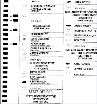 But if you have an oval filled in for Franken and the Independence Party candidate receives an oval with an “X,” the vote is given to Franken.